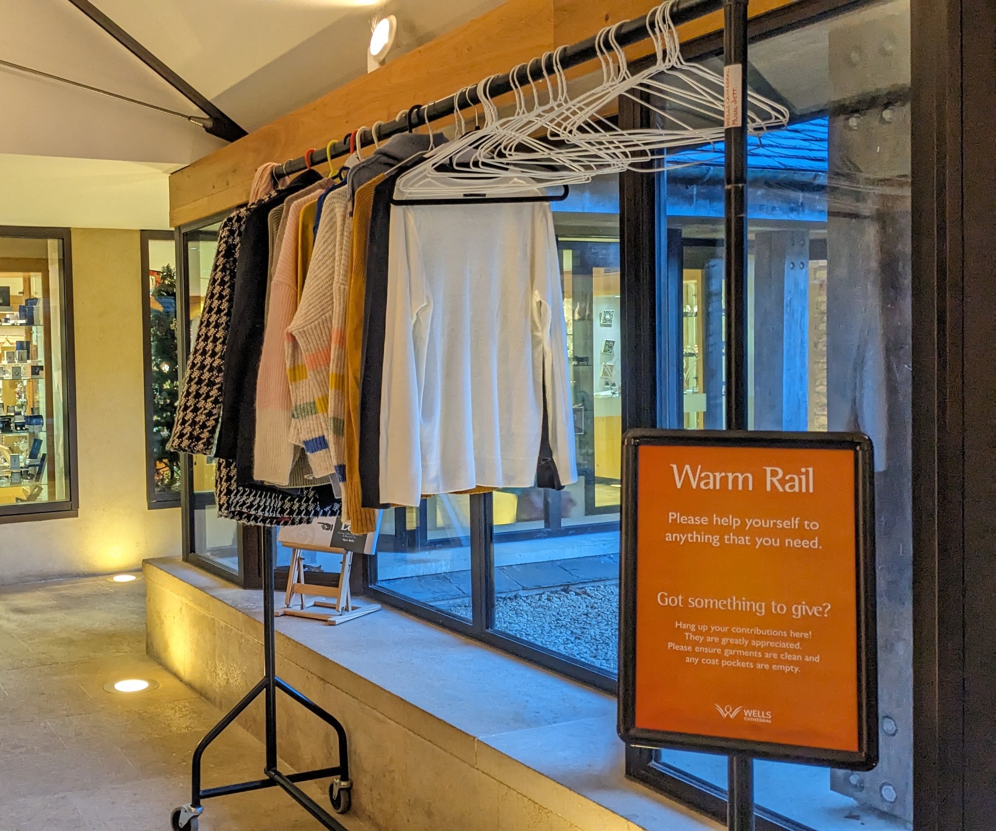 Located outside the Cathedral Shop, the Warm Rail offers free warm clothing for anyone who needs it. You are welcome to take what you need or donate clean, good‑quality garments. Please ensure all pockets are empty before donating.