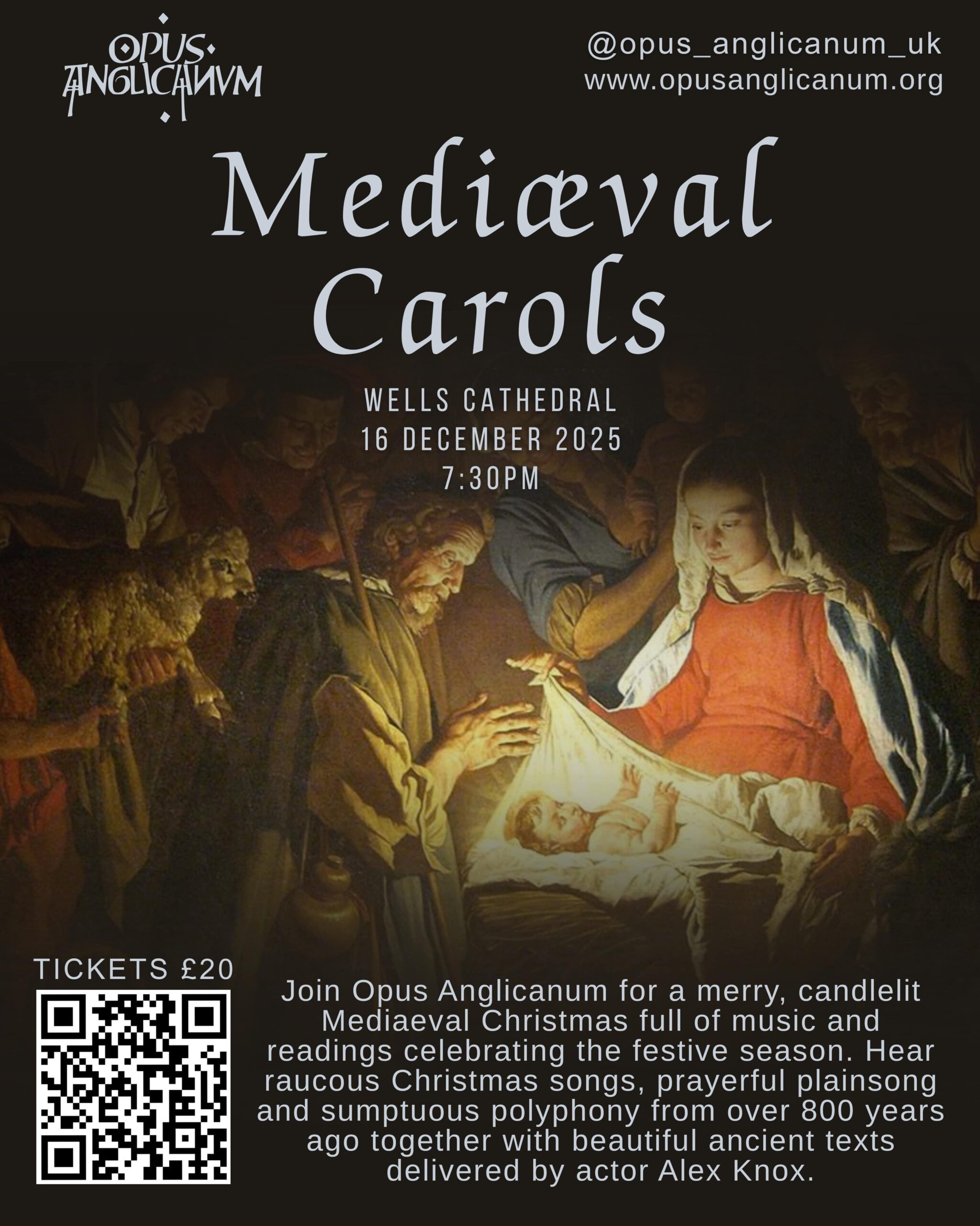Experience a candlelit journey into the spiritual heart of a medieval Christmas. Opus Anglicanum return to Wells Cathedral with their annual sell-out Christmas concert. From simple Gregorian chant and devotional polyphony to joyous & raucous Christmas songs (some of which are over 800 years old), listen to beautiful mediaeval readings interspersed within the music, from actor Alex Knox, creating peaceful moments of quiet reflection.